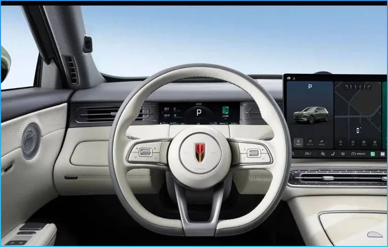 然后内饰这块儿,一进去你就能看到这个三联屏的设计,8.88英寸的仪表加上两个15.6英寸的屏幕,这个视觉冲击力还是有的。我摸了一下这个中控台的材质,用料还可以,有那种软的包覆,然后这个缝线它也做得比较细致。方向盘的手感我个人是比较喜欢的,有一个粘手的感觉,握起来比较舒服,不是那种很滑的塑料感。
