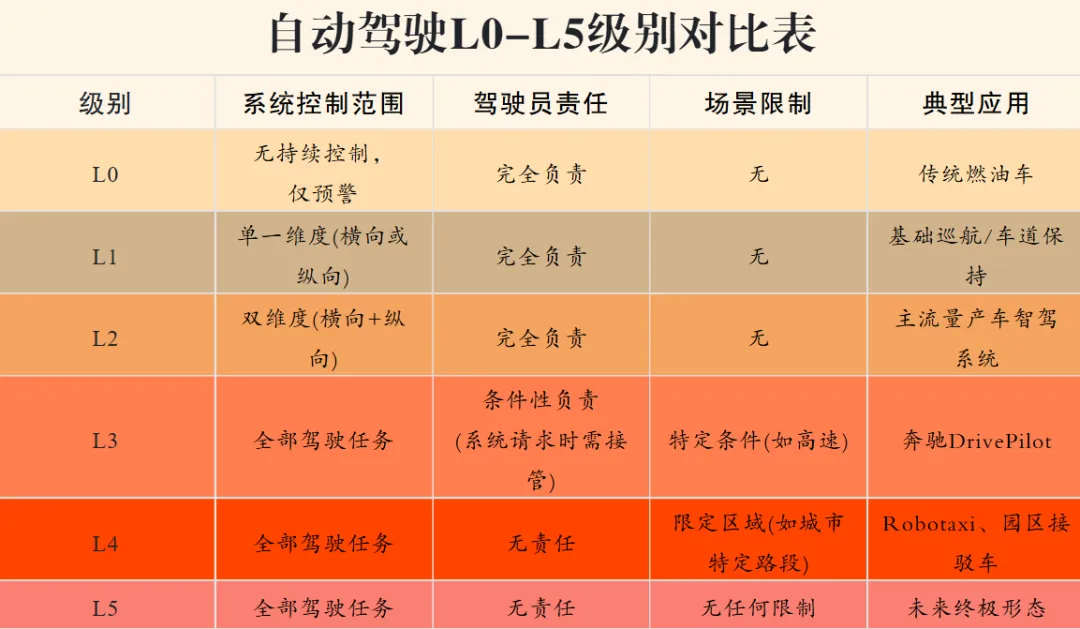 按照国际自动机工程师学会(SAE)和我国国家标准,自动驾驶从低到高分为L0-L5六个等级,每个等级的自动化程度、人机交互方式都有明显区别,而此次获批的L3级自动驾驶,与常见的L2级辅助驾驶相比,有着本质区别。