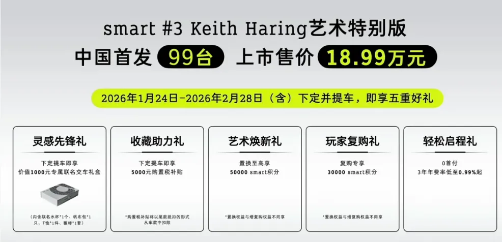 smart精灵#3 Keith Haring艺术特别版刚刚上市,18.99万的指导价配上仅99辆的限量,目标是那些不甘平庸的年轻玩家。