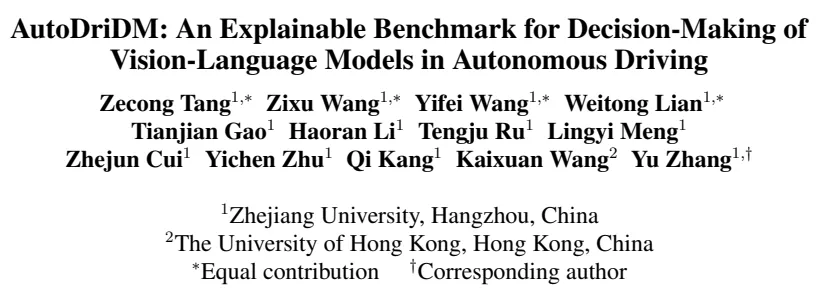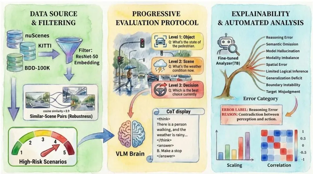 Artificial Intelligence (cs.AI), Computer Vision and Pattern Recognition (cs.CV), Robotics (cs.RO)自动驾驶技术面临复杂场景下的可靠感知和安全决策挑战。近年来,视觉语言模型(VLMs)展示了强大的推理和泛化能力,为自动驾驶提供了新的可能性。然而,现有的基准测试和度量标准过于强调感知能力,未能充分评估决策过程。