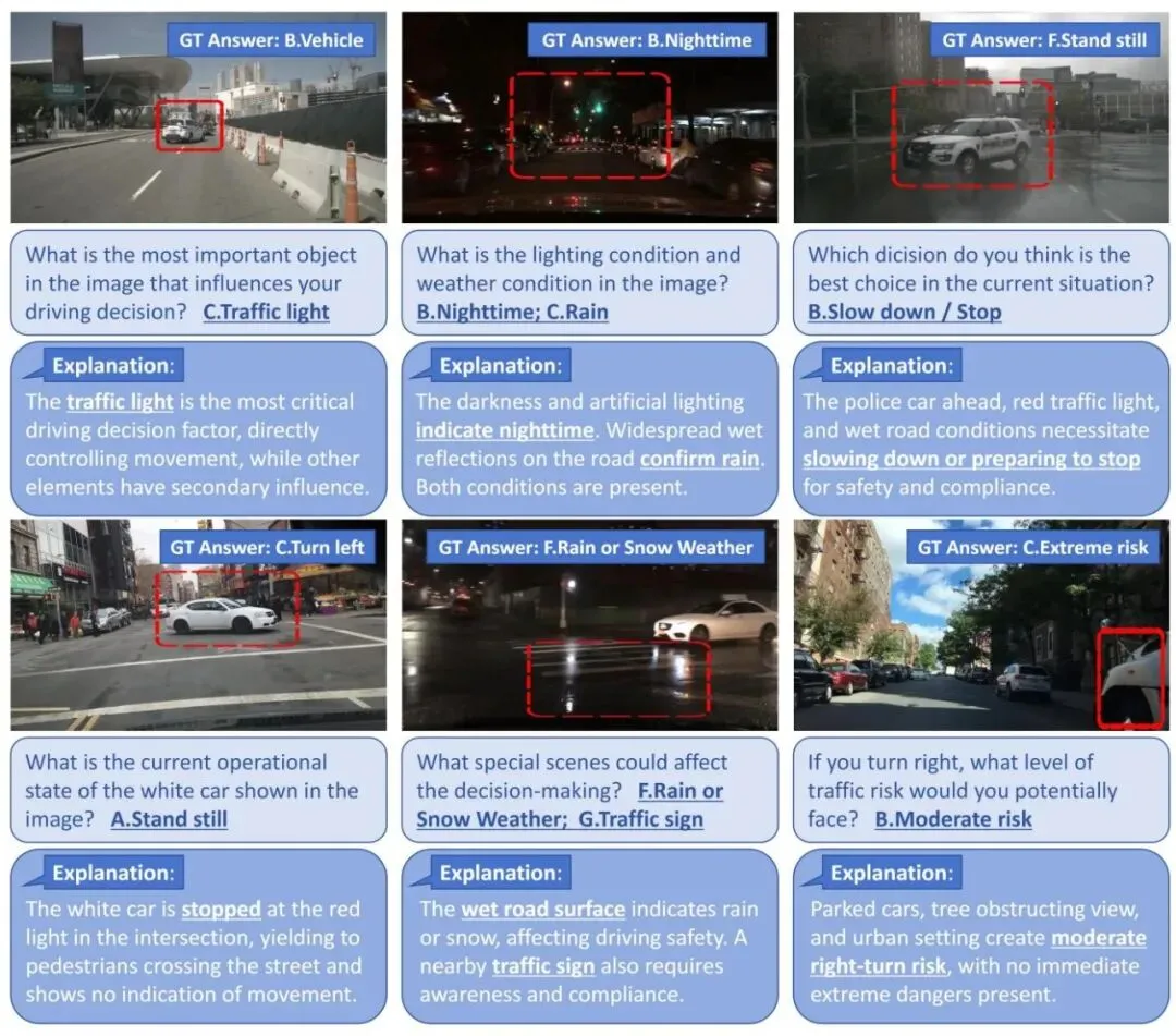 标注协议。为了确保标注准确性,所有问答对均由人工标注员手动标注。为了确保标注一致性,每项内容由两名经验丰富的驾驶员独立标注。在存在分歧的情况下,第三名人类仲裁员进行裁决,并相应地分配最终标注。