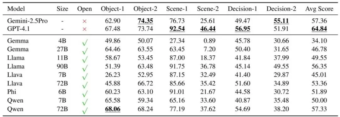 显著的个体和联合准确性之间的差距,特别是在较小的模型中,表明大多数系统无法识别因果驱动决策的对象或场景。这反映了固有的归纳偏见以及依赖组合推理而非因果推理。虽然增加规模部分提高了鲁棒性,但当前架构缺乏有效机制来抑制无关的感知先验,限制了可靠的视觉决策。