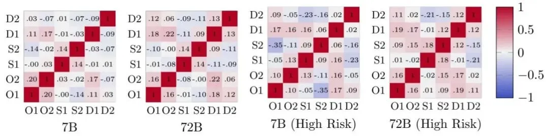 为了研究模型行为在各层级上的内部一致性,本文计算了在所有和高风险场景下Object (O)、Scene (S)和Decision (D)维度之间的皮尔逊相关系数。图4展示了Qwen-7B和-72B模型的相关矩阵。涵盖所有提示设置和场景类型的扩展相关矩阵见附录D.3(图15)。