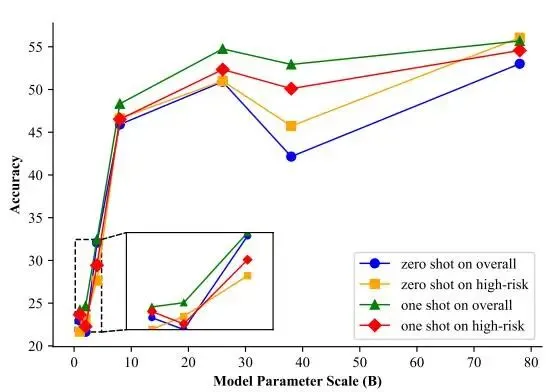 本文评估了Internvl系列参数大小的扩展行为。在传统的扩展定律中,模型性能随着参数大小的增加而提高,并且通常遵循近似对数趋势;然而,在本文的基准测试中,38B模型表现出明显的性能下降(图5)。这种异常现象在-shot设置下以及所有场景和高风险划分中均持续存在。