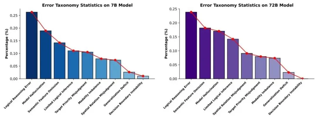 图6揭示了不同大小模型之间误差权重分布的相对排名略有差异,但逻辑推理错误、语义特征遗漏和模型幻觉始终占据前三类错误——其中逻辑推理错误最为突出,表明当前的VLMs仍然难以执行连贯的多模态推理。