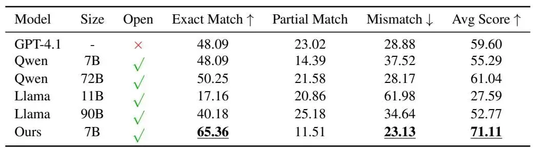 本文将微调后的7B分析器与主流基线进行了对比,如表2所示。本文的模型实现了最高的精确匹配率和最低的不匹配率,相对于包括Qwen(72B)和GPT-4.1在内的更大通用模型,表现更优。平均得分也是所有系统中最好的,表明在各种情况下标签质量的一致性。因此,分析器的输出适用于大规模辅助评估,并支持自动推理轨迹标注。