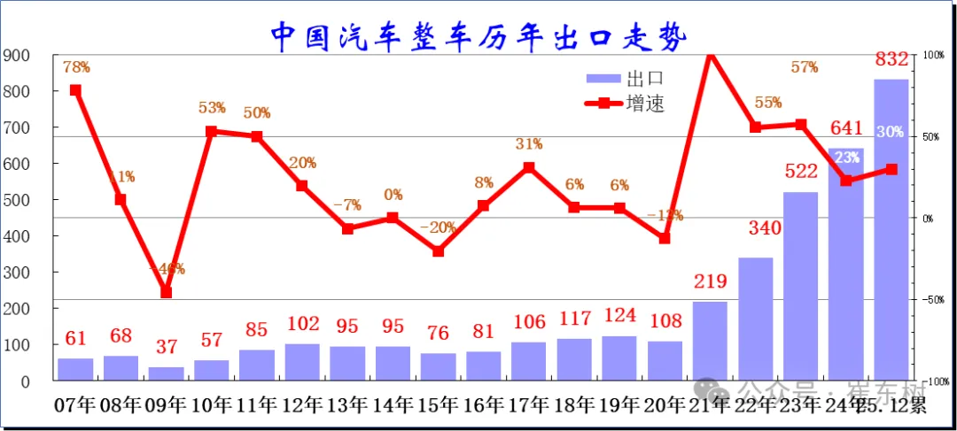 1、1月25日,乘联分会秘书长崔东树发布2025年全年中国汽车出口市场分析,全年中国汽车实现出口832万辆,同比2024年全年增速30%;