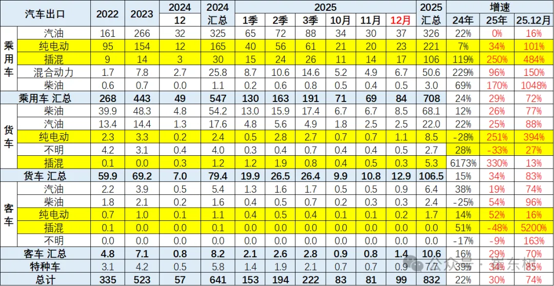 中国新能源车2025年全年出口表现好于预期,主要是插混和混动替代纯电动成为出口增长的新增长点,尤其是插混的皮卡出口表现较强,成为商用车新能源车出口亮点;