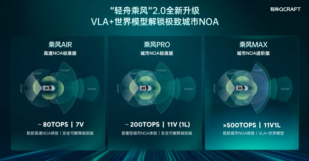 “轻舟乘风”迎来2.0全新升级,正式发布大于500TOPS的解决方案,以“VLA+世界模型”解锁极致城市NOA体验;