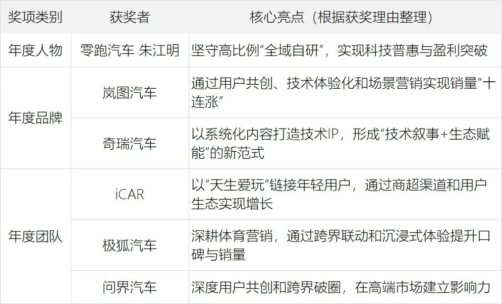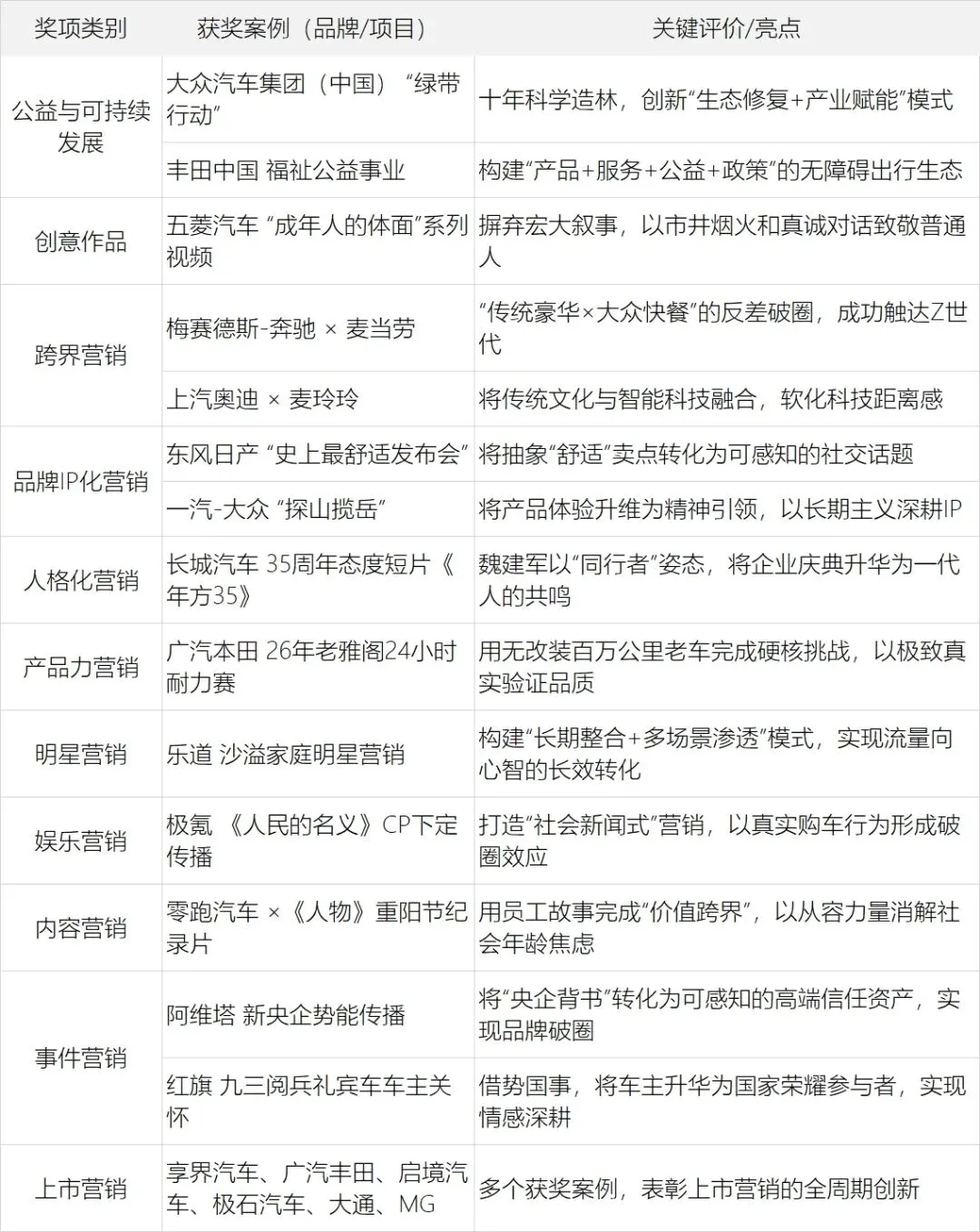 其他类别还包括品牌IP化、人格化营销、产品力营销等,获奖者如保时捷、蔚来、岚图汽车、沃尔沃汽车等