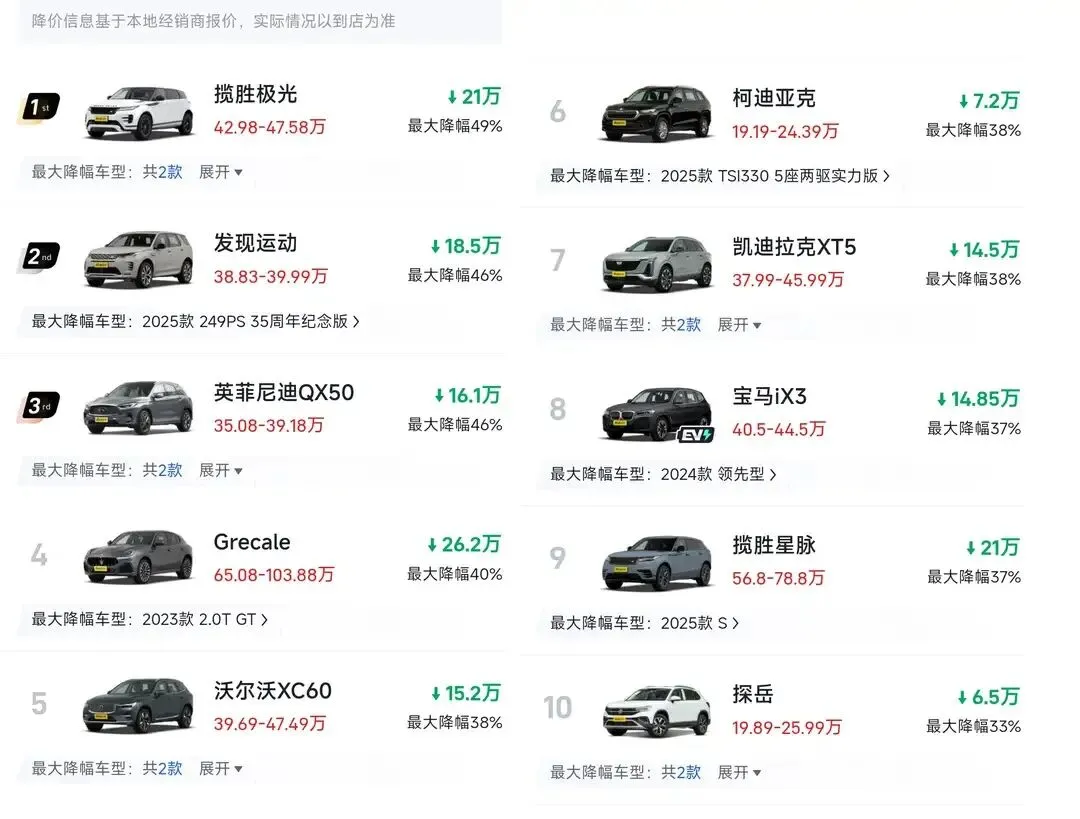 而在此次降价潮中,最让人震惊的当属豪华中型SUV阵营。揽胜极光、发现运动等车型的最大降幅接近50%,实际售价大幅下探,彻底打破了消费者对豪华车型的价格认知;沃尔沃XC60、凯迪拉克XT5等常年热销的豪华中型SUV,也给出了35%以上的优惠力度,入门价格直接下探到合资车型的区间。