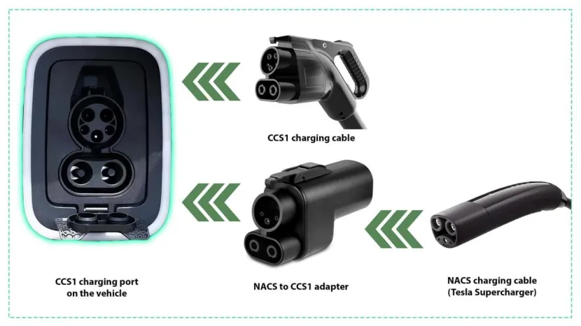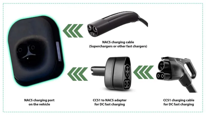 若需在大多数Electrify America、EVGo等运营商的CCS1直流快充桩充电,则需使用CCS1转NACS适配器。