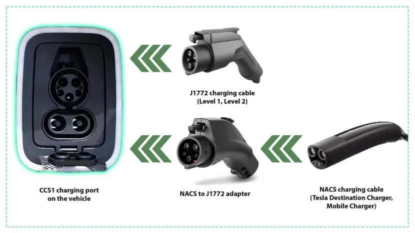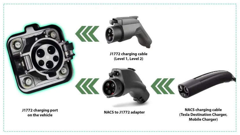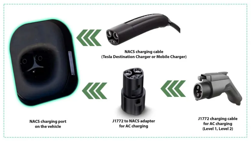3. NACS(北美充电标准):直流快充或交流充电(1级、2级)