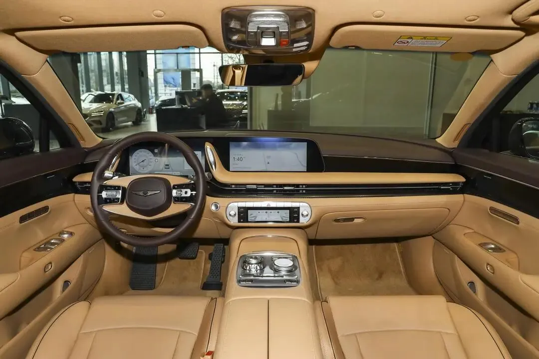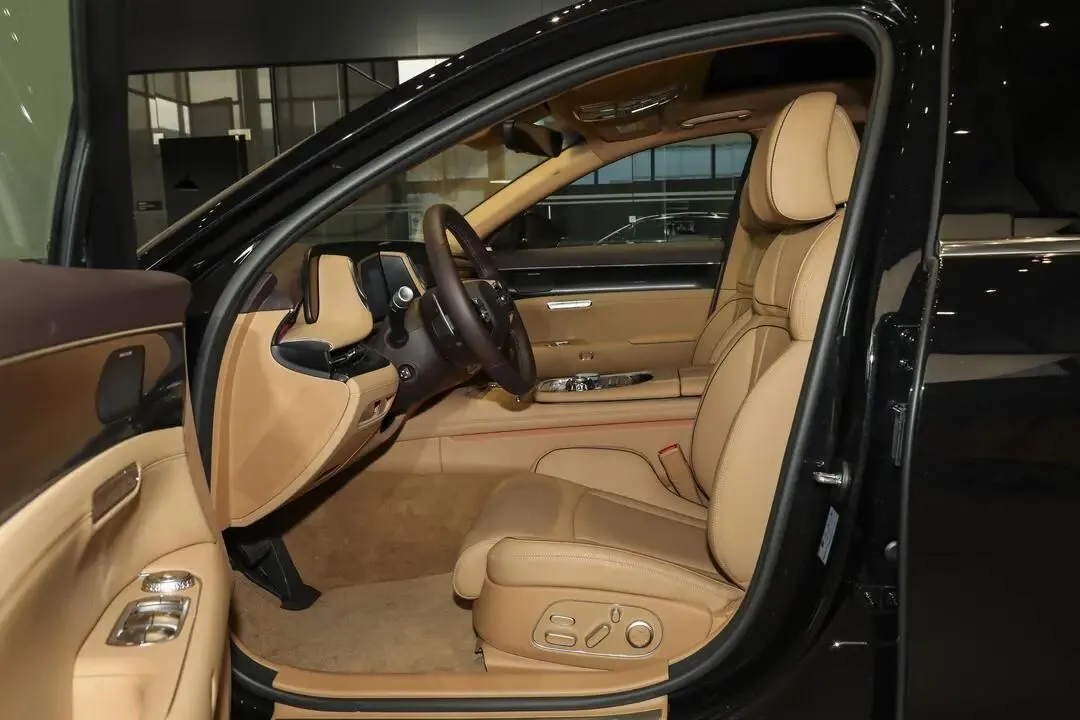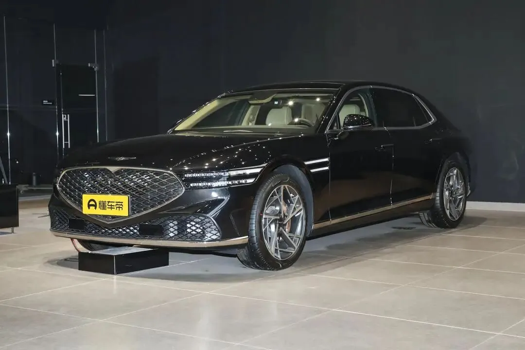 它基于G90量产车型平台打造,3.2米的轴距、5.1米的车身长度,保留了D级轿车的典雅底子,但又给这份典雅套上了“战斗外套”:标志性的盾形格栅依然在,但多了几分锋利;双线大灯的灯带更细,像眯起的“性能眼”;深绿色的车身涂装,在光线里会泛出金属质感,把“典雅”和“侵略性”揉得刚好。