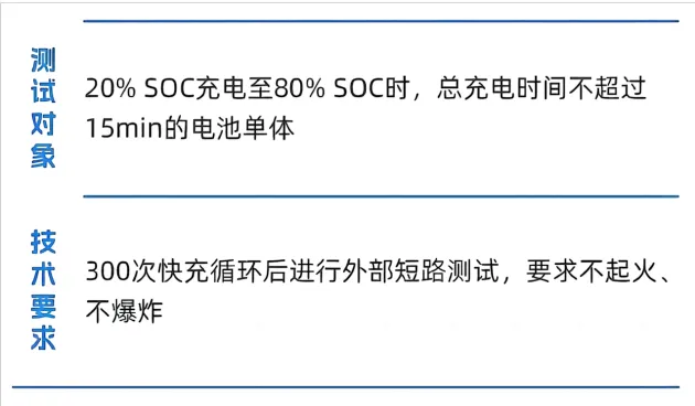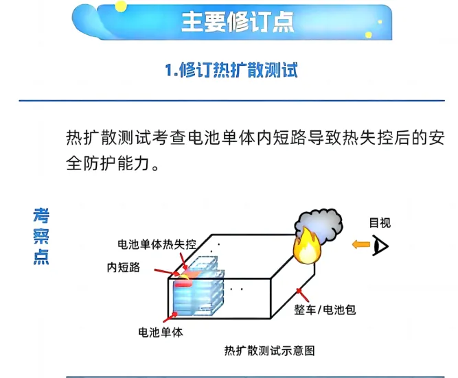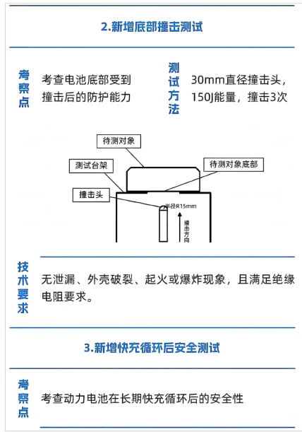 本次修订进一步明确待测电池温度要求、上下电状态、观察时间、整车测试条件,技术要求从此前的着火、爆炸前5分钟提供热事件报警信号等,调整为不起火、不爆炸(仍需报警),烟气不对乘员造成伤害等;新增底部撞击测试,考查电池底部受到撞击后的防护能力;新增快充循环后安全测试,300次快充循环后进行外部短路测试,要求不起火、不爆炸等。