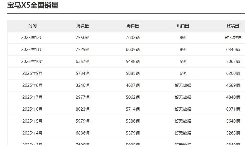 不得不说,宝马X5还是这个级别的香饽饽,尽管目前有比较大的优惠,但2.0T的30LIM运动套装,最低配全款也至少得57万才可以开走,不过25年12月的销量确实是非常好,卖出了7600多台,相比11月份,提升了近1000台,成绩喜人!