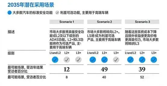 49%的专家预测,到2035年,大众市场将聚焦L2+功能,如增强型自适应巡航、自动变道和拥堵辅助,而非L3及以上级别的自动驾驶技术。