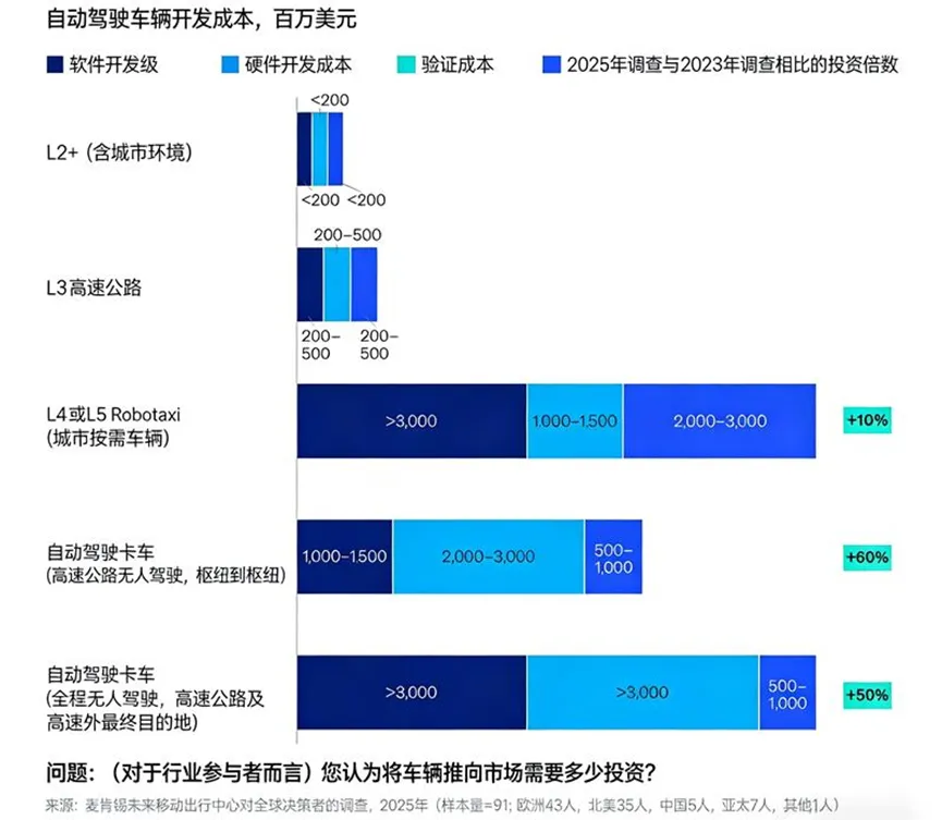调查中反复强调的主题是先进自动驾驶技术的经济负担不断攀升。专家估计,每提升一个自动化等级,成本就会呈指数级增长。
