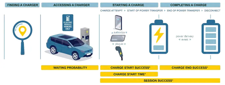 衡量的是在一段时间内,所有客户进行的所有充电尝试中成功的部分所占比例。所谓“成功”是指启动向电动汽车输送电力所需的所有步骤都顺利完成,无需客户重复操作或进行其他干预(包括获得付款授权、验证电动汽车或驾驶员身份、在电动汽车与 EVSE 之间建立通信等)。
