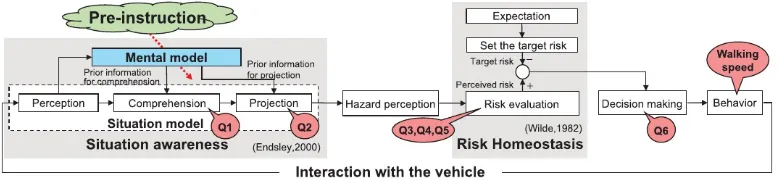 本研究紧密围绕如图1所示的认知-决策-行为模型展开,它将行人与车辆的交互过程分解为三个关键阶段:情境意识、风险评价与决策与行为。本研究创新性地将预指导作为校准行人心理模型的干预手段引入该框架,基于此理论,研究者推导出两个可检验的核心假设: