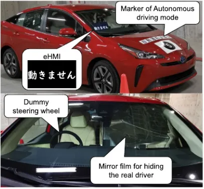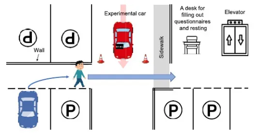 实验通过在左侧车窗贴反光膜完美隐藏真实驾驶员,并在右侧安装假方向盘和假人,成功营造了无人驾驶的视觉效果;eHMI安装在右前挡风玻璃,显示“動きません”(我不动的意思),如图2所示。实验场景模拟停车场行人过街,如图3所示,车辆以约4km/h行驶。