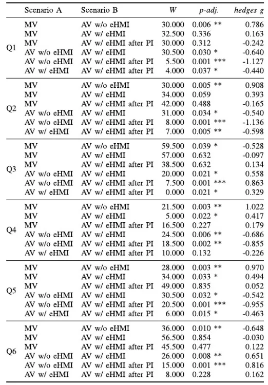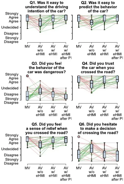 如表1所示,在Q1至Q6所有六个问题上,“AV w/o eHMI”都显著差于“MV”,因此可以得到AV无eHMI时,行人的主观感受最差。