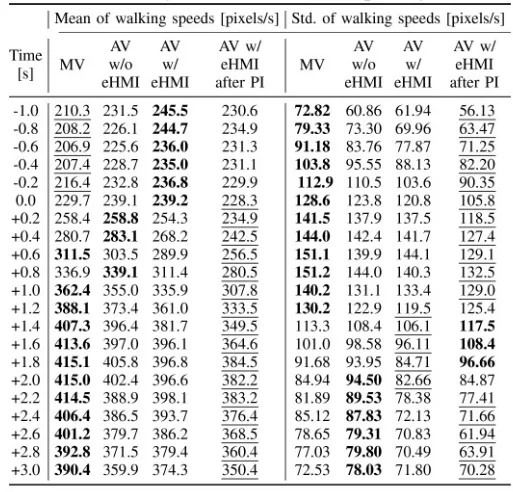 如图8行走速度随时间变化曲线中代表“AV w/ eHMI after PI”的那条线,其阴影部分(表示变异范围)应该是最窄的,表明每个人的速度曲线都紧密聚集在平均值附近;并且在表2中,在[-1.0s, 1.0s]和[2.2s, 3.0s]这两个关键时间段内,“AV w/ eHMI after PI”的速度标准差是所有场景中最低的(表中带下划线的数值代表最小值);由此可得预指导使行人的行走行为更一致、更可预测。