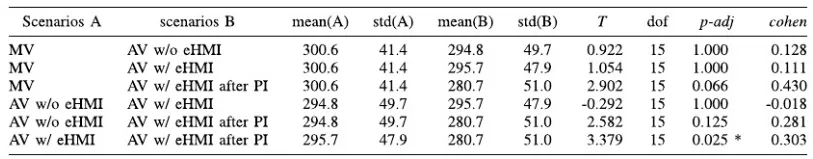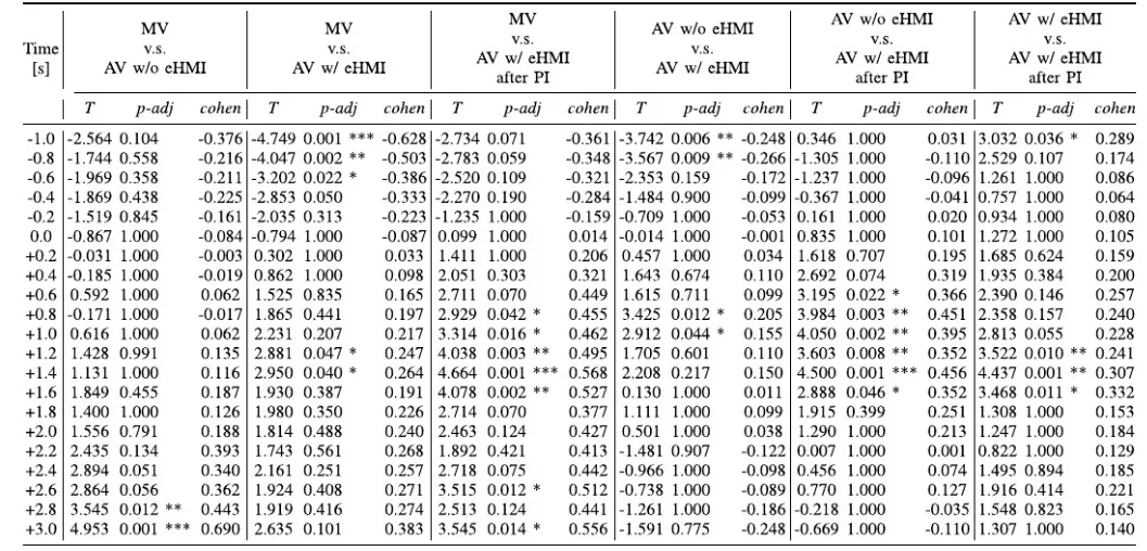 如表3所示,“AV w/ eHMI after PI”的整体平均速度显著低于“AV w/ eHMI”;同样在表4中显示在车辆停止后的0.8s至1.6s内,“AV w/ eHMI after PI”的速度显著低于“MV”;因此可得预指导使行人的行走速度更慢、更从容。