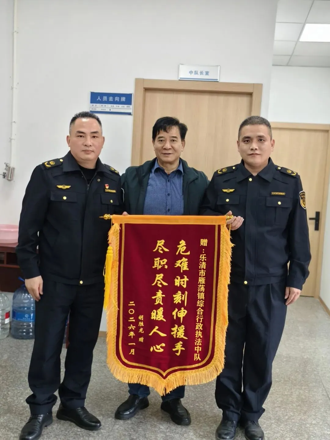 1月19日,获救群众专程来到雁荡执法中队,将一面印有“危难时刻伸援手,尽职尽责暖人心”的锦旗送到执法队员手中,再三致谢:“当时情况太危险了,多亏你们巡查及时、果断施救,才让我们转危为安!”此次救助充分彰显了雁荡执法中队队员“人民至上、生命至上”的责任担当和高效的应急处置能力。下一步,乐清市综合行政执法局将持续强化队伍建设,在做好城市管理执法工作的同时,筑牢辖区群众生命财产安全防线,用实际行动践行执法为民的初心使命。