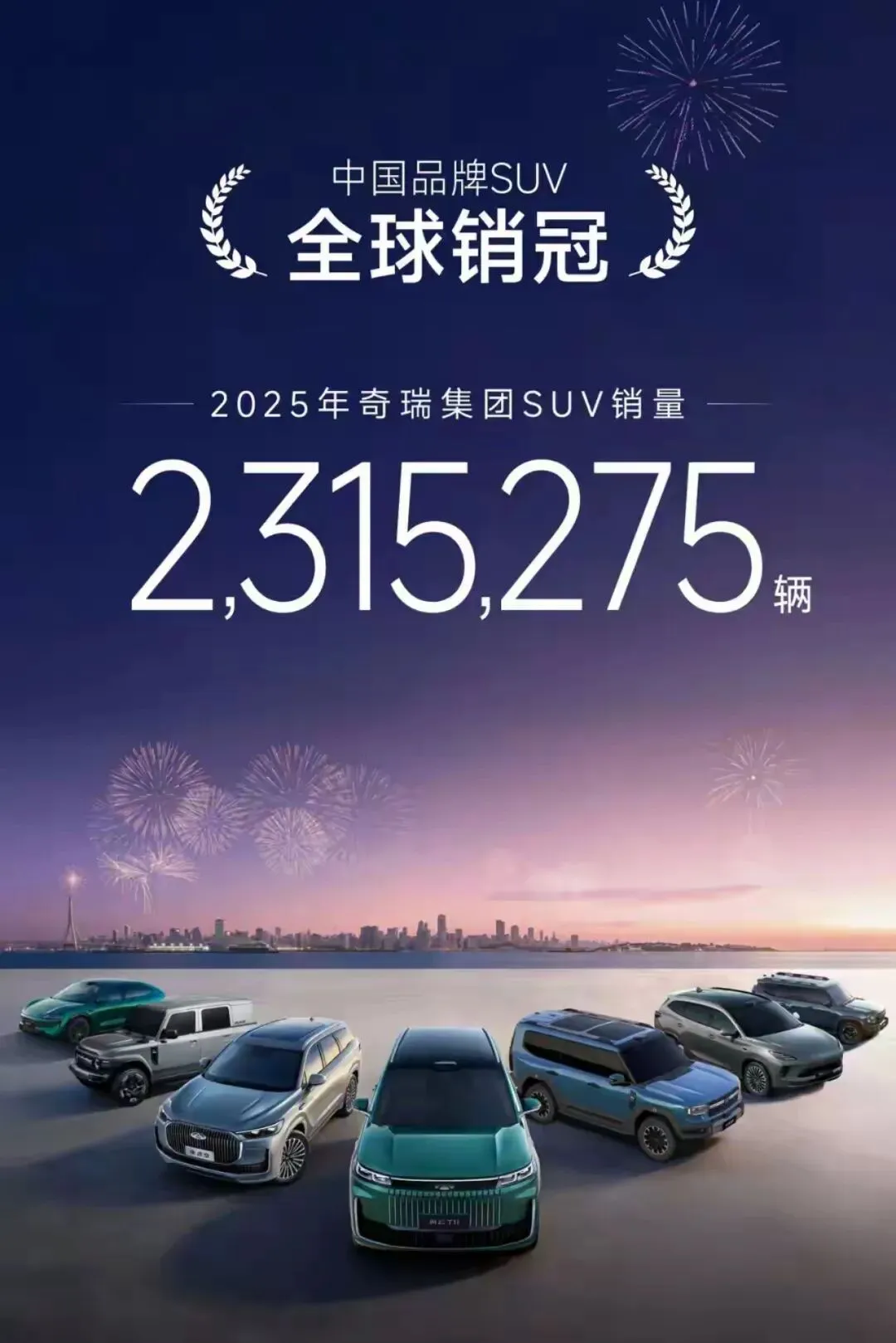 1月24日,奇瑞集团正式发布2025年销量核心数据,集团全年SUV车型全球销量突破231万辆,成功摘得中国品牌SUV全球销量冠军,以硬核实绩彰显中国汽车品牌在全球市场的核心竞争力。这一成绩的取得,并非偶然,而是奇瑞集团多年来深耕产品研发、完善全球布局、打造全品类产品矩阵的必然结果,也让中国品牌在全球SUV市场的舞台上占据了重要一席。