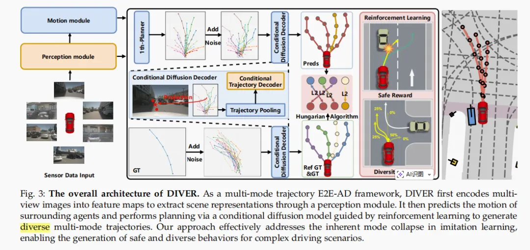现有的端到端自动驾驶方法,主要以来单一专家轨迹进行模型学习,这往往导致驾驶行为保守且同质化,难以泛化到复杂的真实世界中。因此本文提出DIVER方案,讲基于扩散范式的轨迹预测与强化学习结合,以生成多样且安全的轨迹。本文主要贡献: