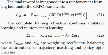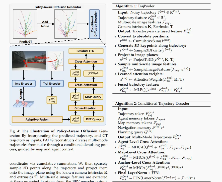 本文提出的方法叫Policy-Aware Diffusion Generator,强调"策略生成",这与我们常用的轨迹生成稍有不同。比如diffusiondrive,用的是条件概率建模,训练的目标是模仿专家轨迹。PADG把扩散的过程视为随机策略,每一次去噪采样等价于一次policy sampling,多模态轨迹等价与policy中的action samples。下面我们具体看细节如上图DIVER 由两个主要组件组成:感知模块和运动规划模块。该系统以原始感知特征作为输入,并输出未来轨迹的分布,左边这部分我们再熟悉不过了,不赘述了,主要看中间部分PADG。输入:GT轨迹和预测轨迹,预测轨迹来自前面模型输出(推测是已经训好的sparsedrive模型输出的轨迹)模型训练部分:对轨迹进行加噪,DDPM方式加噪然后使用模型(Condition Diffusion Decoder)进行去噪,模型(Condition Diffusion Decoder)将环境信息当做条件学习噪声预测,对噪声轨迹进行去噪,得到去噪后的真值轨迹和预测轨迹,通过二分匹配,进行轨迹refine。需要补充的是,GT轨迹在去噪后还会增加Reference GT轨迹进行监督,目的是为了提升模型的探索能力,不至于模态坍缩。下图为Condition Diffusion Decoder具体结构“we sample reference GT trajectories from the empirical distribution of expert behaviors”,本文的构造方法是从相似场景/相似状态条件下从数据集中采样不同驾驶意图的专家轨迹。强化学习部分:环境状态s->Diffusion Policy πθ(去噪网络)->采样多条轨迹->计算轨迹reward->构造GRPO advantage->对πθ进行参数更新;推测:去噪时间步内每一步可以认为是一次状态转移,可以使用该强化训练。多样性奖励(Diversity Reward):通过最大化轨迹间距离来促进轨迹多样性,鼓励扩散模型探索更广泛的可行行为,而非坍塌到冗余模式安全奖励(Safety Reward):用于惩罚与静态或动态障碍物间距过小的预测路径。轨迹一致性奖励 (Trajectory Consistency Reward):鼓励当前规划的轨迹与上一时刻的轨迹保持平滑过渡,避免车辆出现不稳定的抖动。车道保持奖励 (Lane Keeping Reward):用于惩罚频繁或不必要的变道行为总结: