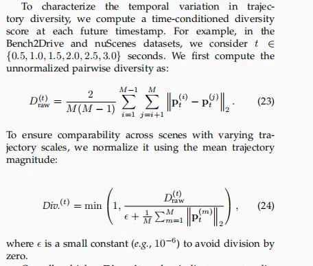 好的:评测的时候增加了轨迹多样性指标,这种之前论文很少有关注这块,下面两个公式主要做多样性评测,第一个公式,看模态和模态见的距离,距离越大值越大,但不同场景尺度可能不同如高速和路口,所以通过第二个人公式进行尺度归一化,这样保证不同速度/场景下是可比较的。- 最关键的部分,参考GT轨迹怎么构造的讲的不够细致,不透明;