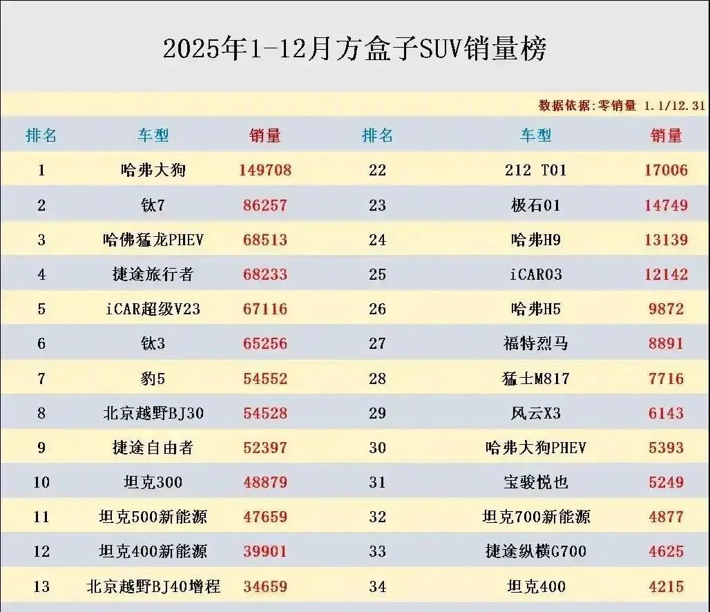 说真的,我以前也觉得方盒子就是小众情怀,看着酷炫但没人买。结果数据一打脸,我差点把咖啡喷了。哈弗大狗稳坐第一,149708辆,钛7、捷途旅行者这些直接干到6万-15万区间,豹5、坦克300更是杀进前十。这哪是玩票?分明是真香现场,把“方盒子卖不动”的鬼话按在地上狂摩擦。