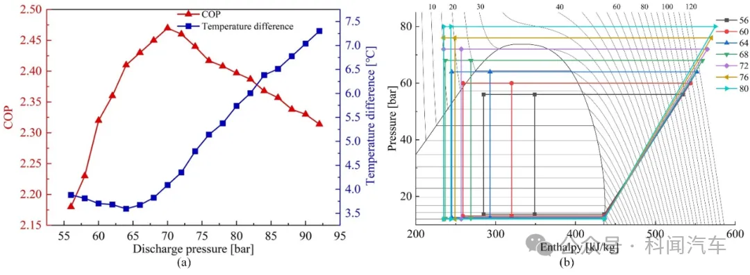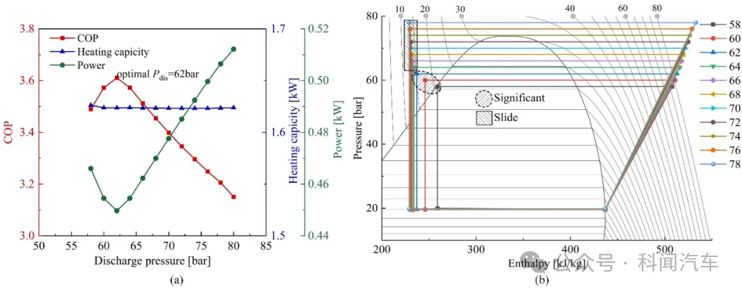 图2 乘员舱加热结果:(a) 排气压力对COP、加热功率和系统耗功的影响; (b) 从58 到78 bar的排放压力的P-H图