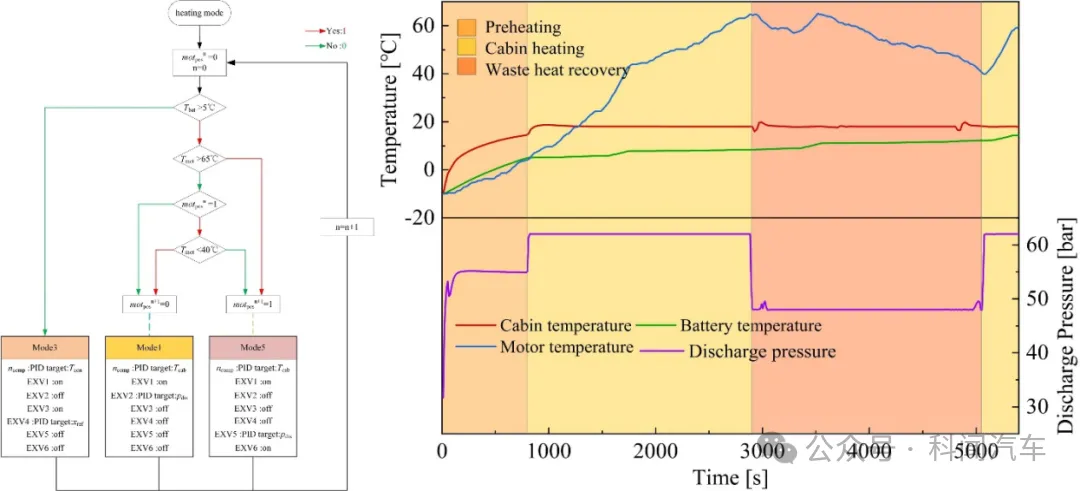 为研究基于CO2热泵的综合热管理系统(TMS)的动态和稳态表现,创建了多部件耦合模型,对低环境温度下,世界轻型汽车测试循环工况(WLTC)中,该热管理系统的性能进行了一维仿真研究。首先,结果表明,混合通风下,仅座舱加热的最佳排气压力为62bar。其次,在加热座舱与电池的并联与串联结构之间,串联预热通过维持亚临界循环并通过利用座舱吸收制冷剂的过热热量,保证冷板中制冷剂潜热传递,可以保持电池温度均匀来改善电池加热的效果。而冷凝温度应维持在18°C以确保亚临界循环,冷板出口处的CO2质量分数应为零以防止过冷,从而确保电池的温度均匀性。 此外,对于电机的过剩热量回收,在热管理系统的吸热源仅为电机与吸热源为电机和环境之间,前者具有更高的 COP(性能系数)。而排气压力应维持在 48bar来获得可接受的电机温度下降速率和系统整体较高的COP。最后,一种可切换模式和模式内优化的组合控制策略能够在环境温度为 −15°C下,连续WLTC运行下,实现座舱、电池和电机的协同温度控制和系统COP优化。