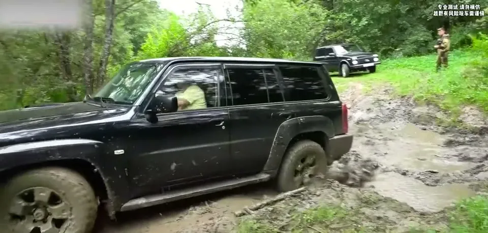 经典越野车日产途乐轻松通过泥泞路面,展现其强大的越野性能。