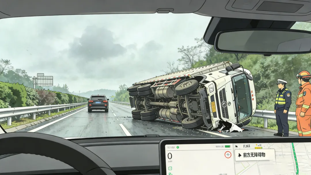 然而,前方突发交通事故——被害人乔某驾驶的货车失控侧翻,正停在车道上等待救援。邱某某所依赖的辅助驾驶系统未能及时识别前方静止的事故车辆及现场人员。直至系统发出减速提示音,邱某某才猛然回神并紧急制动,但因距离过近、车速过快,车辆在不到两秒内撞上乔某及其侧翻的货车。