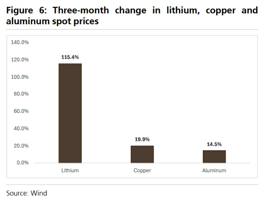 瑞银表示,综合计算,仅金属原材料一项,纯电动车(BEV)的单车成本通胀就高达 人民币5600元(其中锂贡献了大部分涨幅,高达109%的价格反弹)。