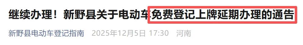 近期,全国多地针对电动车市场的管理政策频出,两轮、三轮和四轮电动车、摩托车都在管理范围内,不仅对广大车主带来较大的影响,就连经销商也不例外。一旦违反这些规定,将面临罚款甚至扣车的严厉处罚,具体一起看看。据河南省南阳市新野县电动车登记备案工作领导小组发布的通告,全县二、三轮电动车及低速电动四轮车免费登记备案工作将持续至2026年1月31日,此期间车主可前往各备案点完成免费备案,为车辆申领号牌。