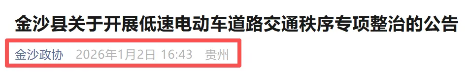 近期,贵州省毕节市金沙县公安局、市场监督管理局、交通运输局等多部门联合发布《关于开展低速电动车道路交通秩序专项整治的公告》。根据公告安排,自2026年2月2日起,当地交管部门将在全县域内全面启动低速电动车集中整治行动。