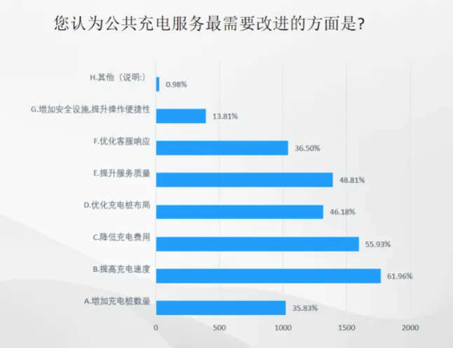 在公共充电服务最需要改进的方面,提高充电速度(61.96%)、降低充电费用(55.93%)、提升服务质量(48.81%)位列前三。