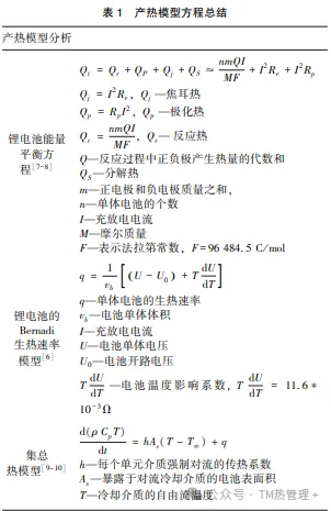 锂电池工作时,在电池的内部会发生化学反应从而产生电, 而其中的化学反应也很复杂, 一 般地,可以将锂电池的发热量分为四部分:焦耳热 Qj、 极化热 Qp、 反应热 Qr、分解热 Qs。美国 加州大学 Bernadi 从两个方面入手———熵增反应 原理和锂离子电池内阻,同时假设电池是均匀热源且热源稳定,反应热和极化热都被视为不可逆反应,得到锂离子动力电池的生热速率来估算电池热源模型。集总热模型则描述了电池组的温度随时间的变化。下面对电池产热的相关公式进行总结,基于电池产热模型的各研究参数见表1。上述对锂电池在充放电过程中主要产热的四部分进行研究,而在不同的工作环境下,这四部分所产生的热量占比又各有不同,而生热速率模型和集总热模型又能分析锂电池的生热动态速率。上述模型为分析产热提供了基础,可以通过计算模拟以及实验的方式更加精确地得到电池系统的产热量以及产热速率,同时也能够对电池热管理产生深远的意义。