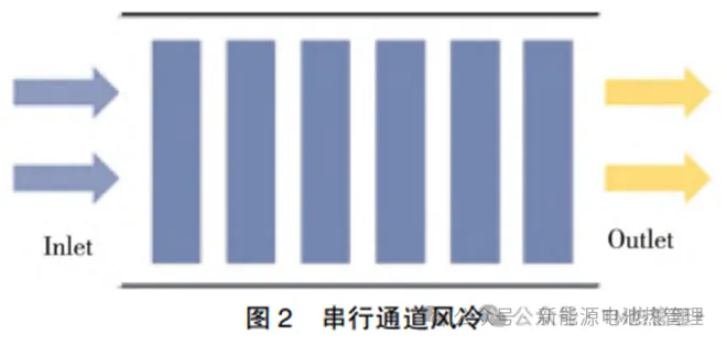 空气冷却的冷却通道很大程度上影响着电动汽车锂电池组的散热能力和均温性,以下将针对空气冷却通道发展成果进行分析。ZHAO 等研究了一种串行通风方案,如图 2 所示,其中电池单元在电池组内等距排列,采用双通道的方法,进风口与出风口平行,外部的空气通过进风口进入电池系统,穿过电池之间的缝隙,将电池产生的热量带走。由于是串行通风,容易导致电池温度分布不均匀,而且在电动汽车高强度工作时,被动风冷散热能力不足以将电动汽车运行过程中产生的热量带走,因此增加风扇或者鼓风机等主动风冷方法能够带来更好的散热效果。