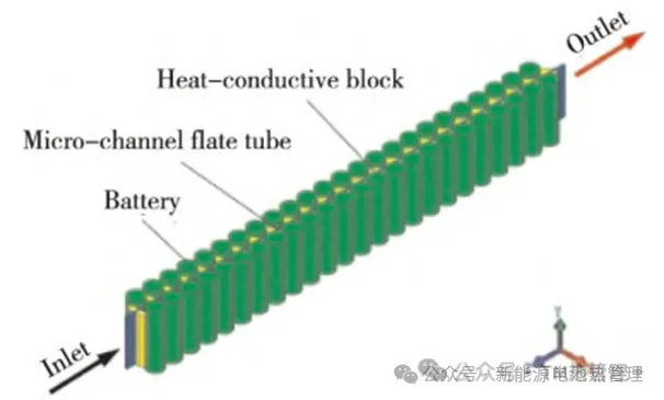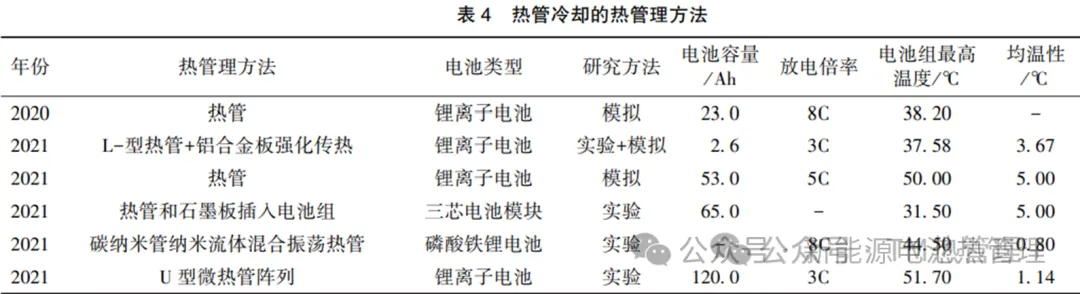 热管的种类有:烧结热管、重力热管和平板热管等。Ren 等采用 U 型微热管阵列辅以主动风冷的冷却方法, 如图 7 所示,能够使单体电池最大温差为 1. 14 ℃ , 并且随着进口风量的增加,温控性能会跟着提高,但电池组的温度均匀性略有下降。HE 等采用 L 型热管耦合铝合金板对电池进行热管理, 如图 8 所示,在 3C 的放电倍率情况下将电池组的最高温度控制在37. 58 ℃ ,温差控制在3.67 ℃ 。下面针对不同的热管冷却方 式的电池热管理进行了总结,基于热管冷却电池热管理方法的各研究参数见表 4。