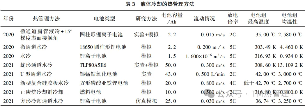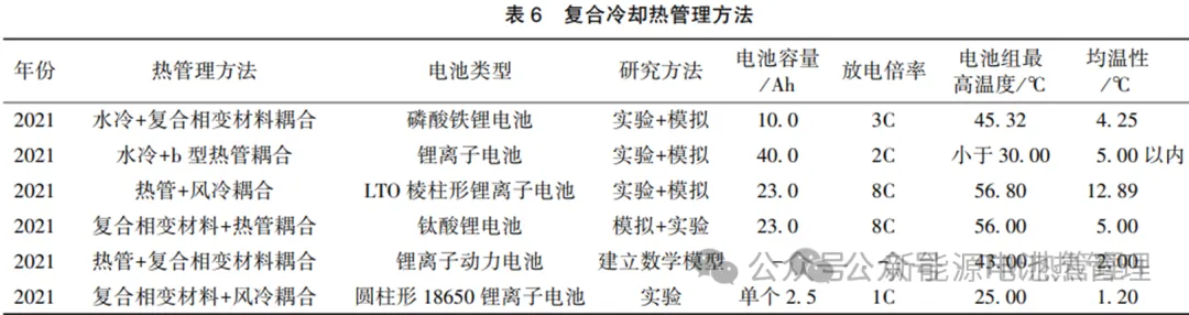 单一的冷却方式很难满足电池系统的热管理需求,但是各种冷却方式又有其特点和优势。所以,将两种或两种以上的冷却方式融合形成复合冷却,取长补短,能够发挥出更佳的热管理能力。下面针对不同复合冷却方式的电池热管理进行了总结,基于复合冷却电池热管理方法的各研究参数见表 6。