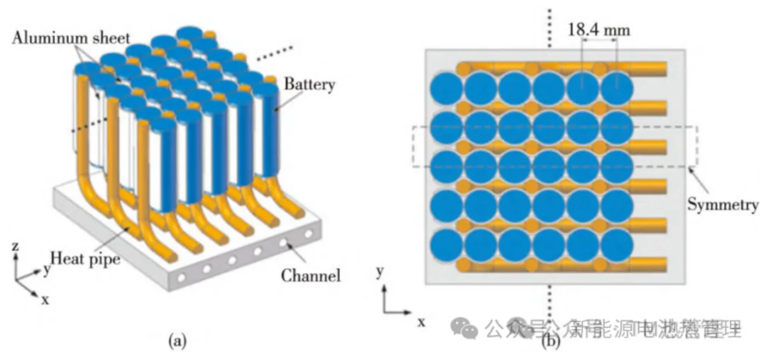 图 8 电池热管理系统 L 型热管的几何模型 (a)、 顶视图 (b)