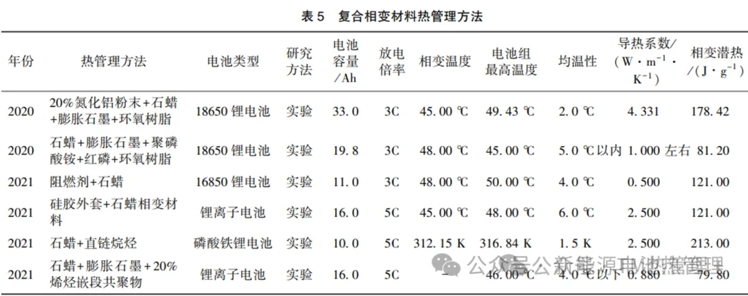 相变材料是一种能够在一定温度范围内改变自身物理状态的材料。相变材料具有很高的潜热值,在发生相变过程中能够吸收大量的热量。其分类包括:有机相变材料、无机相变材料和复合相变材料。将复合相变材料应用在电池热管理中,其工作方式是先以显热的形式吸收电池时所产生的热量,达到相变温度后以潜热的形式吸收,由于相变过程中温度基本保持不变,这能给锂电池组提供很好的均温性,在选择复合相变材料方面选择相变温度在电池最佳工作温度范围内,使得锂电池能够持续高效地运行。下面针对不同复合相变材料的电池热管理进行了总结,基于复合相变材料冷却的电池热管理方法的各研究参数见表 5。