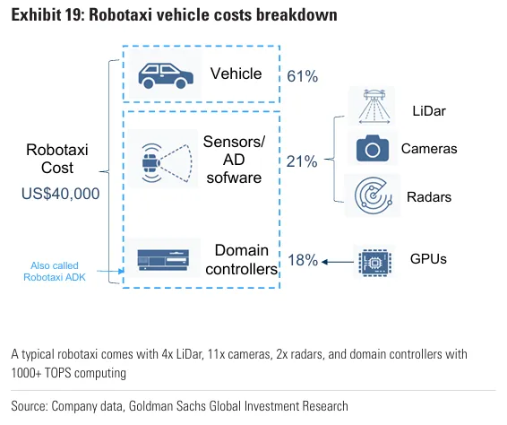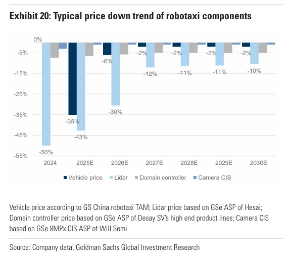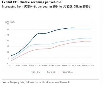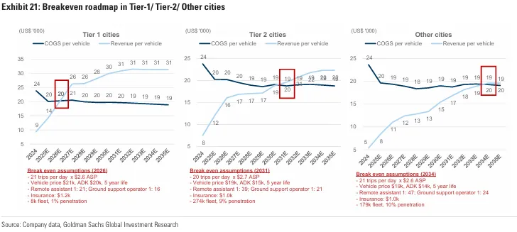 高盛预测中国Robotaxi机器人出租车每辆车收入,从2024年的每年5,000美元~9,000美元增长到2035E年的20,000~31,000美元。主要得益于每日订单增加和运营天数增加驱动。在高盛的分析中,通过(1)每天订单数量、(2)每订单的ASP,以及(3)每年运营天数,来评估Robotaxi的收入来源。预计到 2035 年,中国一线、二线及其他城市的单车年收入将分别达到 31,000 美元、22,000 美元和 20,000 美元。届时,单车日订单量有望提升至 29 单。作为对比,Pony AI 在 2024 年的单车平均日订单已达 15 单,高于深圳网约车司机的平均水平(12 单),但仍低于全职出租车司机(25 单)。 行业预计 2025 年一线、二线及其他城市的单车日订单均为 15 单,到 2035 年分别增长至 29、22 和 21 单。由于 Robotaxi 可实现最长 22 小时的每日运营(预留 2 小时用于维护与充电),相比传统网约车或出租车的 15 小时运营具有明显优势。到 2035 年,每单 ASP 预计最高可达 3.0 美元。Robotaxi 的定价将低于传统网约车/出租车,且不同城市间存在显著差异。尽管每公里票价预计持续下降,但平均订单金额将继续上升:从 2025 年东部一线/二线/其他城市的 2.6/2.3/1.6 美元,提高至 2035 年的 3.0/2.8/2.6 美元,主要受益于更大的运营范围与更长的平均行程。运营天数方面,预计 2025 年可达 350 天,并在 2026–2035 年提升至 365 天,以最大化车辆利用率。单车成本?到2035年一线城市单车运营成本降至1.9万美元高盛预测根据模型测算,Robotaxi 在一线城市的单车年度运营成本将从 2025 年的 2.01 万美元逐步下降至 2035 年的 1.89 万美元。尽管整体成本呈下降趋势,但不同成本项的变化方向并不一致。主要的成本降低将由车辆本体和智驾套件成本驱动。 细节上,新车型(Pony AI Gen7、WeRide GXR、Apollo Go Gen6)的成本正在显著降低;传感器、域控制器、激光雷达等核心部件价格快速下滑;软件成本随规模扩大被摊薄。预计整车成本将从2025 年的 44,000 美元降至 2035 年的 32,000 美元。 其次,远程监控的成本也将显著下降。单车远程助手成本:2,600 → 1,200 美元;每位远程监控人员可管理的车辆数从 ≤20 辆提升至 50–100 辆。 但规模的扩大,也将上升一些运营成本。维护、清洁、充电、地面支持人员成本随订单量与车队规模增加;平台分成(10% GMV)随收入增长而上升;电力成本随行驶里程增加而上升(2035 年一线城市日均行驶 284 km)。盈亏转折点?一线2026/二线2031/三线2034 一线城市最早盈利,2035 年毛利率可达 40%。订单密度高、ASP 较高、车辆利用率强,使其在 2026 年 即达到盈亏平衡。随着 ADK 与车辆成本下降、运营效率提升,毛利率预计在 2030 年升至 34%,并在 2035 年进一步提升至 40%。 二线城市在 2031 年实现盈亏平。订单量与 ASP 略低于一线城市,但随着规模扩大、ADK 成本下降、远程监控效率提升,预计在 2031 年 实现盈亏平衡,并在 2035 年达到约 16% 毛利率。 其他城市盈利最晚,2034 年转正。由于订单密度与 ASP 更低,其他城市的 Robotaxi 盈利时间点最晚,预计在 2034 年 才能实现单车毛利转正,2035 年毛利率将继续改善。一二三线城市在不同时间点出现拐点,预测的曲线形状相似
