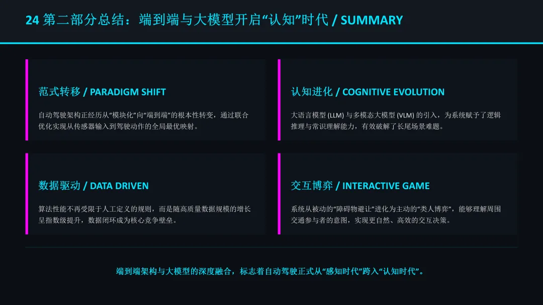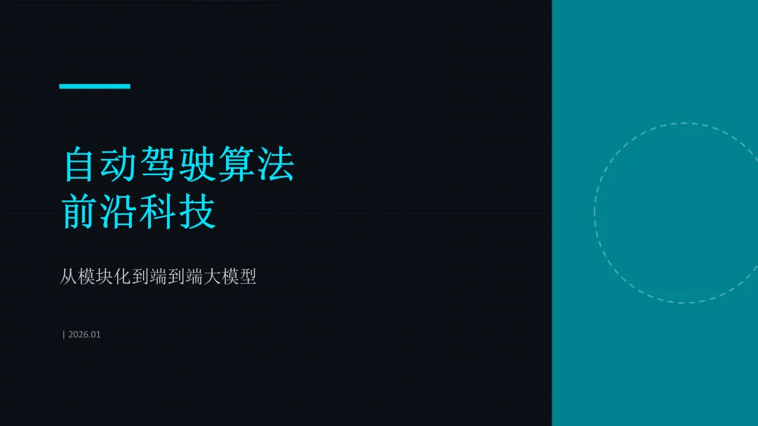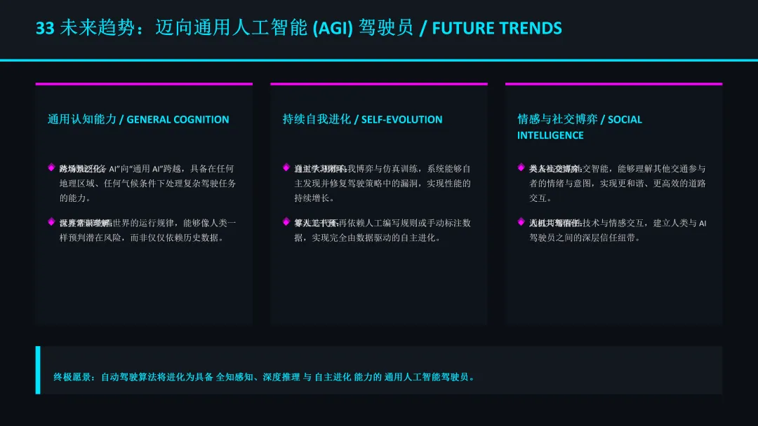 自动驾驶算法正处于从“工程学”向“人工智能”的转型期。端到端架构、大模型认知和世界模型仿真共同构成了下一代自动驾驶系统的核心技术栈。最终目标是迈向具备通用认知、自我进化和社交博弈能力的 AGI 驾驶员,实现真正的无人驾驶。